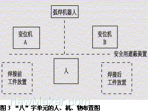 使用送料車把已裝好工件的夾具送至機器人位置的方式(如圖4),可以大大減少人的介入,實現(xiàn)節(jié)省人力的目的。由于變位機也是與自動搬運裝置配套,可以將以前由人來檢查系統(tǒng)運轉及焊接質(zhì)量的機能完全機械化,整個設備更先進、復雜。