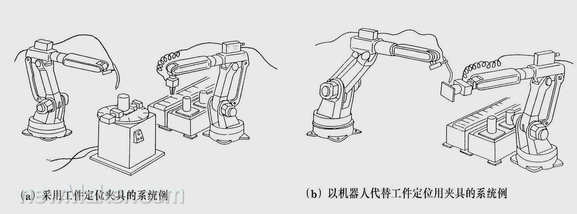 *隨著機器人控制機能的高度發(fā)展,采用新的機器人控制器實現(xiàn)用機器人外部軸代替專用機械制成的工裝夾具,如無定位夾具的協(xié)調(diào)焊接系統(tǒng)(如圖5)。實現(xiàn)方法分為:機器人持工件操作和無工裝夾具,附回轉式接頭等多種形式;