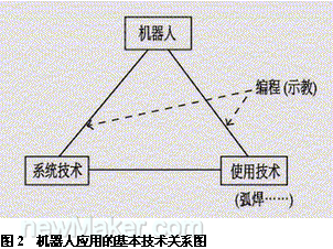 作為系統(tǒng)技術,不是將這些方面獨立地考慮,而是必須綜合考慮從用戶及機器人廠家兩方提出的各種制約條件中,選擇最佳設備,也就是把一個以使用技術和系統(tǒng)技術支撐機器人的最佳系統(tǒng)提供給用戶。圖2表示作為機器人應用的基本技術,就是要以系統(tǒng)技術為基礎。