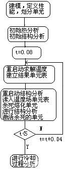 本文利用ANSYS軟件進(jìn)行有限元計算。ANSYS針對不同物理場的分析提供了兩種耦合方式:直接耦合和間接耦合。嚴(yán)格來說溫度場分析和位移場分析是直接耦合的,但由于試驗證明這種耦合作用是非常小的,所以忽略不計。在計算時采用了建立在子步級別上的間接耦合方式。即:將時間劃分成足夠小區(qū)間(子步),每一區(qū)間內(nèi)先進(jìn)行瞬態(tài)熱分析,求解結(jié)束后將熱流梯度最大時刻的結(jié)果存入單元表中;然后進(jìn)行單元轉(zhuǎn)換,以相同的幾何模型、單元劃分進(jìn)行結(jié)構(gòu)分析,導(dǎo)入單元表結(jié)果數(shù)據(jù)作為結(jié)構(gòu)分析的邊界條件,作靜態(tài)自由變形的結(jié)構(gòu)分析。以此流程先進(jìn)行5秒的焊接加熱過程模擬,之后進(jìn)行約60秒的冷卻過程模擬。加熱階段的命令流程如圖2所示。
